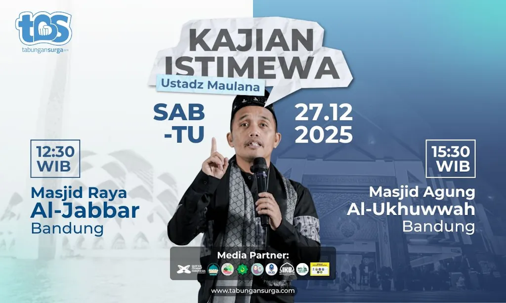 Dipenghujung tahun 2025 Tabungan Surga mempersembahkan sebuah acara yang sangat bermanfaat untuk dihadiri bersama keluarga untuk mengisi waktu liburan kalian. Tabungan Surga membuat Event Kajian Istimewa Spesial Akhir Tahun yang akan dihadiri oleh pemateri spesial yaitu Ustadz Maulana salah satu dai nasional yang terkenal dengan slogan "Jamaah oh Jamaah" beliau akan hadir membersamai Kegiatan ini dua Masjid yaitu Masjid Raya Al-Jabbar dan Masjid Agung Al-Ukhuwah Kota Bandung.